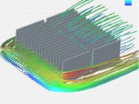 | 圖2:對通過平直散熱片散熱 的空氣流動應用計算型流體動 力學模擬。散熱片區域中過早的空氣 流通出口反而會影響熱性能。 |