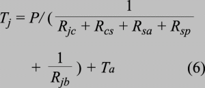 在給定Vd時,解聯立方程式3、4、5可以得到Vf。如前所述,結溫是考慮元件熱完整性的真正標準,因此應該使用結點到環境的熱阻Rja獲得Tj表達式,它是許多參數的函數。