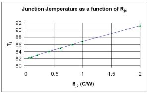 圖9顯示結溫是結點到外殼熱阻的函數。Rjc的減小對降低結溫有很大的影響。它們的關係幾乎是線性的,而且不會達到無溫差的情況。