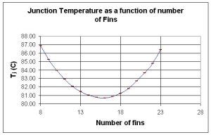 圖10顯示結溫是散熱片數量的函數。將散熱片數量增加到15個以上會使結溫上升。即使表面積提高,也會引起散熱器中更多的壓力下降,從而降低空氣流速。散熱片的實際數量隨空氣流速而定。