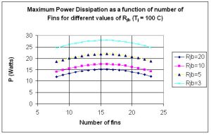 圖11顯示當Tj等於1,000℃時,最大功耗在結點到板熱阻的不同值處是散熱片數量的函數。如前所述,當達到最大熱量散發時散熱片的數量就是最佳數量。本圖也表明Rjb值不會對散熱片的最佳數量有任何影響。