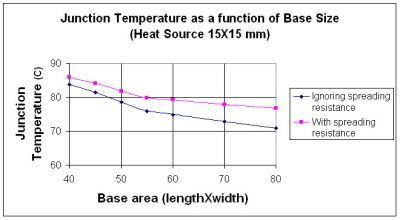 圖12顯示對於15×15mm固定面積的熱源來說,結溫是基底面積的函數。散熱片間距離在所有尺寸下都保持不變。本圖的重要結論是,與相同大小的散熱器、但在散熱器基底均勻散發熱量相比,通過增加散熱器尺寸、擴散熱阻增加到70×70mm2基底尺寸以外的區域並不會明顯降低結溫。